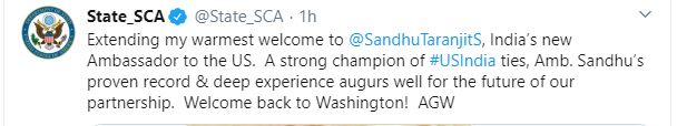 "Extending my warmest welcome to Taranjit Singh Sandhu, India's new Ambassador to the US. A strong champion of US-India ties, Ambassador Sandhu's proven record and deep experience augurs well for the future of our partnership. Welcome back to Washington! AGW," Alice Wells, US Principal Deputy Assistant Secretary wrote on Twitter.