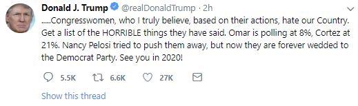 "Get a list of the HORRIBLE things they have said. Omar is polling at 8%, Cortez at 21%. Nancy Pelosi tried to push them away, but now they are forever wedded to the Democrat Party. See you in 2020!," the Tweet read.