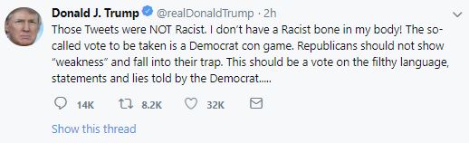 "Those Tweets were NOT Racist. I don't have a Racist bone in my body!" Trump wrote on Twitter, adding that the Republicans should not "show weakness and fall into their (Democrat's) trap."