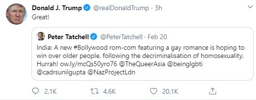 "Great!" the US president wrote as he retweeted a post by British LGBT activist Peter Tatchell, who celebrated the Bollywood movie with a "Hurrah!"