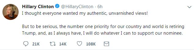 "I thought everyone wanted my authentic, unvarnished views," Clinton tweeted. "But to be serious, the number one priority for our country and world is retiring Trump, and, as I always have, I will do whatever I can to support our nominee," she said.