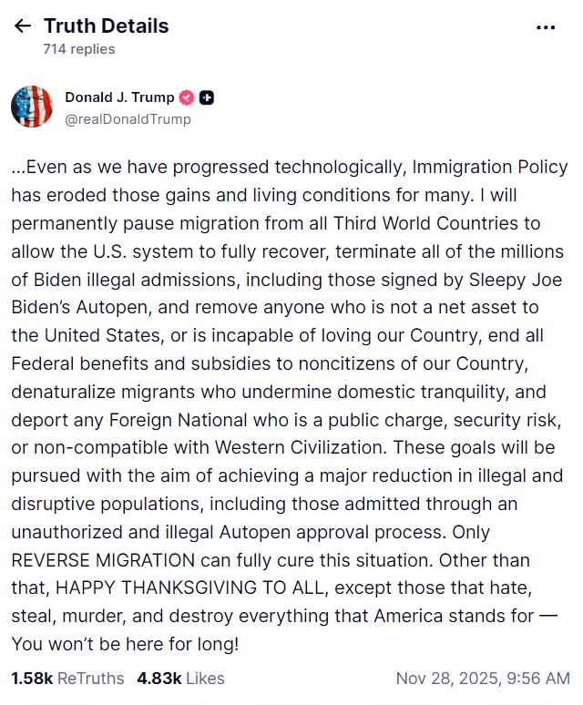 In a post on Truth Social, Trump said, "I will permanently pause migration from all Third World Countries to allow the US system to fully recover, terminate all of the millions of Biden illegal admissions, including those signed by Sleepy Joe Biden's Autopen, and remove anyone who is not a net asset to the United States, or is incapable of loving our Country, end all Federal benefits and subsidies to noncitizens of our Country, denaturalize migrants who undermine domestic tranquillity, and deport any Foreign National who is a public charge, security risk, or non-compatible with Western Civilization."