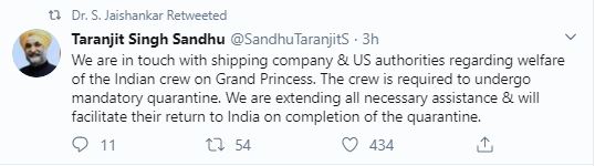 "In touch with shipping company and US authorities regarding the welfare of Indian crew on Grand Princess. They are required to undergo mandatory quarantine. We're extending necessary assistance and will facilitate their return on completion of quarantine," Sandhu said in a tweet.