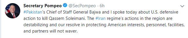 "Pakistan's Chief of Staff General Bajwa and I spoke today about US defensive action to kill Qassem Soleimani. The Iran regime's actions in the region are destabilizing and our resolve in protecting American interests, personnel, facilities, and partners will not waver," wrote Pompeo on Twitter.