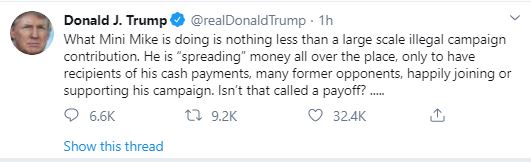 "What Mini Mike is doing is nothing less than a large scale illegal campaign contribution. He is "spreading" money all over the place, only to have recipients of his cash payments, many former opponents, happily joining or supporting his campaign. Isn't that called a payoff?" Trump tweeted.