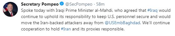 "Spoke today with Iraqi Prime Minister al-Mahdi, who agreed that Iraq would continue to uphold its responsibility to keep US personnel secure and would move the Iran-backed attackers away from US Embassy in Baghdad. We'll continue cooperation to hold Iran and its proxies responsible," wrote Pompeo in a tweet.