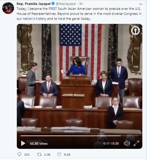 Jayapal took to Twitter to share a clip of Tuesday's session where she can be seen presiding over the House as a temporary speaker. In the text that accompanied the clip, Jayapal wrote that she was "beyond proud" to preside over the House and serve in "the most diverse Congress in American history."