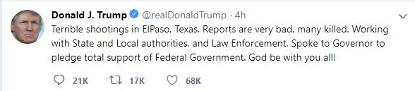 "Terrible shootings in ElPaso, Texas. Reports are very bad, many killed. Working with State and Local authorities, and Law Enforcement. Spoke to Governor to pledge total support of Federal Government. God be with you all!"