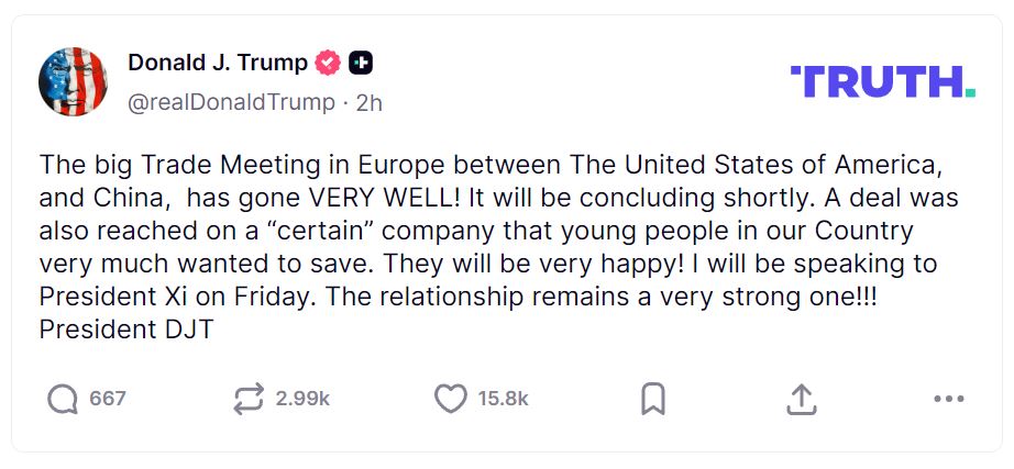 "The big Trade Meeting in Europe between The United States of America, and China, has gone VERY WELL! It will be concluding shortly. A deal was also reached on a 'certain' company that young people in our Country very much wanted to save. They will be very happy! I will be speaking to President Xi on Friday. The relationship remains a very strong one!!! President DJT," Trump said on his social media handle Truth Social. Earlier in the day, Trump also touched upon the future of TikTok in the United States, saying that China will ultimately play a key role in deciding the app's fate as trade negotiations between the two countries continue.
