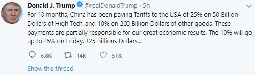 In a pair of tweets on Sunday, Trump wrote, "For 10 months, China has been paying Tariffs to the USA of 25% on 50 Billion Dollars of High Tech, and 10% on 200 Billion Dollars of other goods. These payments are partially responsible for our great economic results. The 10% will go up to 25% on Friday."