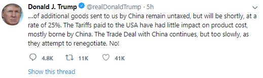 " 325 Billion dollars of additional goods sent to us by China remain untaxed but will be shortly, at a rate of 25%. The Tariffs paid to the USA have had little impact on product cost, mostly borne by China. The Trade Deal with China continues, but too slowly, as they attempt to renegotiate. No!" He added.;