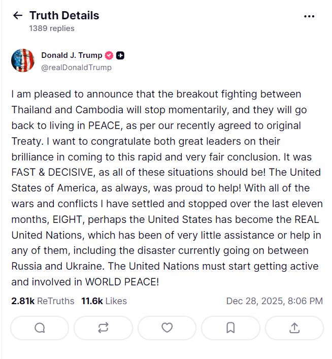 Trump took to his Truth Social platform to describe the agreement as "FAST & DECISIVE, as all of these situations should be!" He said the United States, which participated in mediation efforts alongside China and Malaysia, was "proud to help."
