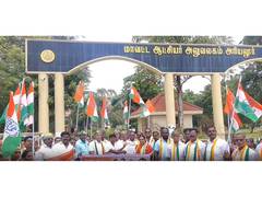 Congress party members in Ariyalur district staged a protest on Thursday, condemning the removal of Mahatma Gandhi's name from the Mahatma Gandhi National Rural Employment Guarantee Scheme (MGNREGA).